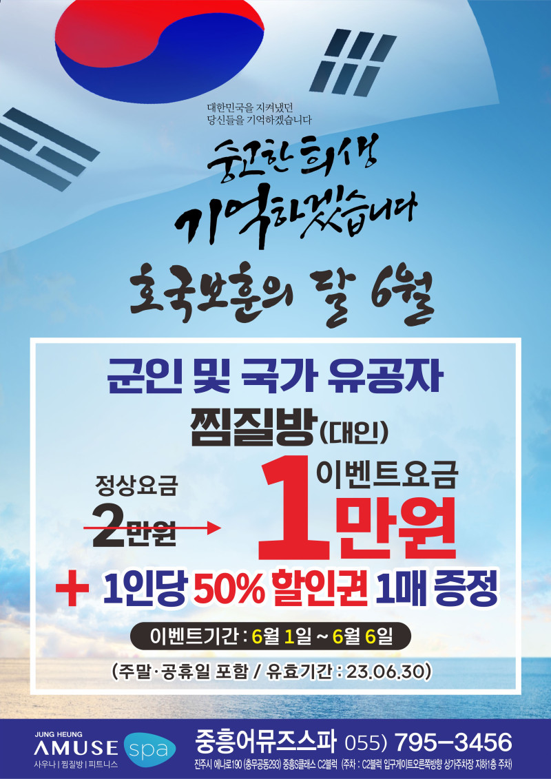 6월 호국보훈의 달 군인및 국가유공자 찜질방 입장료 50% 할인이벤트
