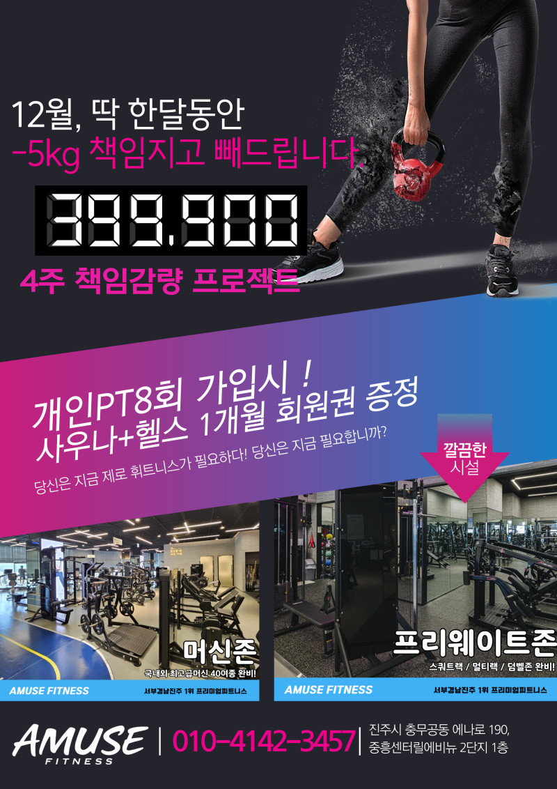 12월 한 달, 5kg 책임감량 프로젝트! 4주 책임감량 프로그램! 지금 개인 PT 8회 등록 시 사우나 + 헬스 1개월 회원권 무료증정!