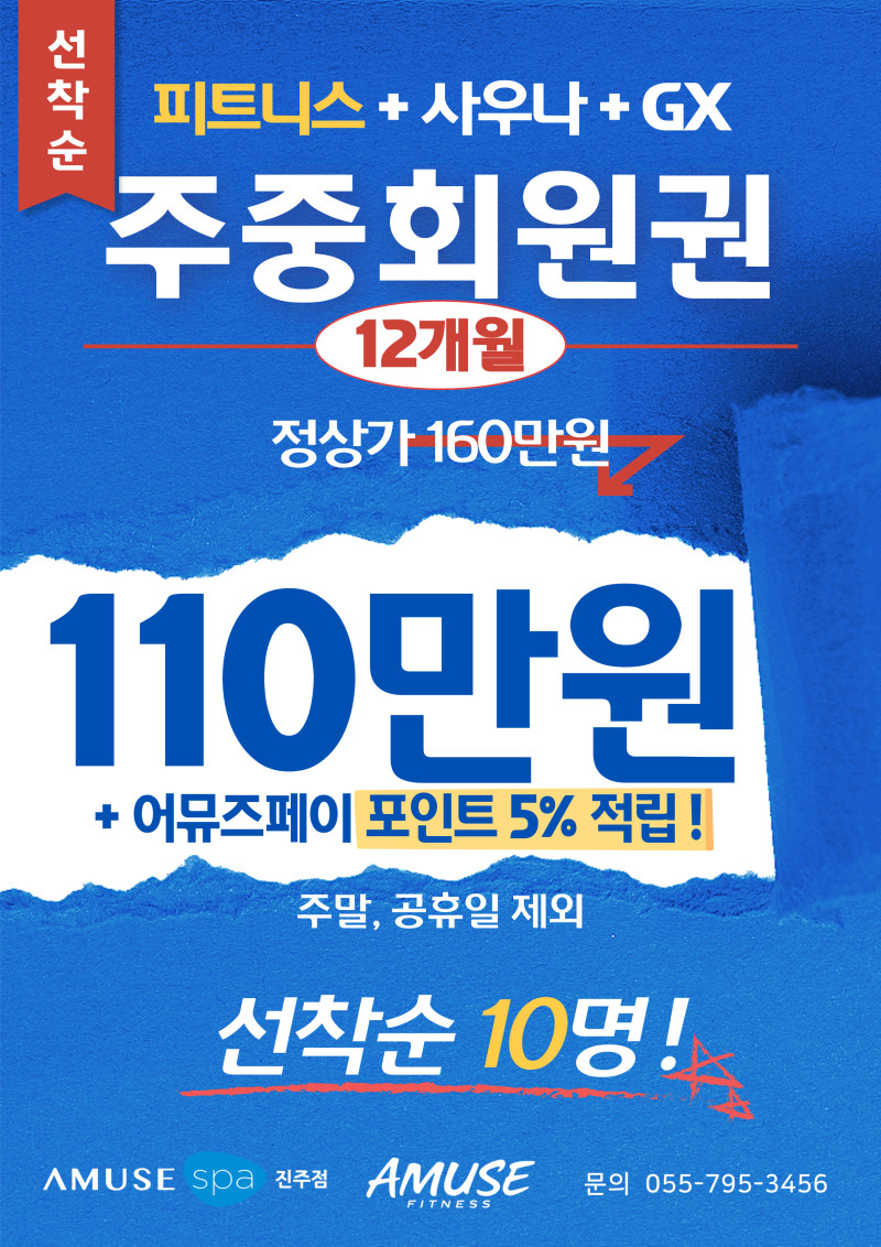 ★어뮤즈스파진주점 피트니스 주중회원권 12개월 특별 이벤트★ 헬스, 사우나, GX까지 한 번에!