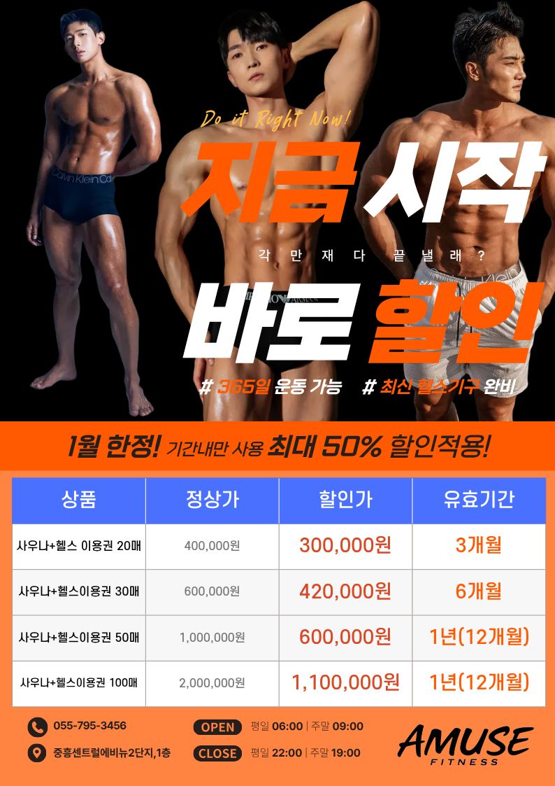 지금 시작, 바로 할인! 1월 한정 사우나 + 헬스 이용권 이벤트