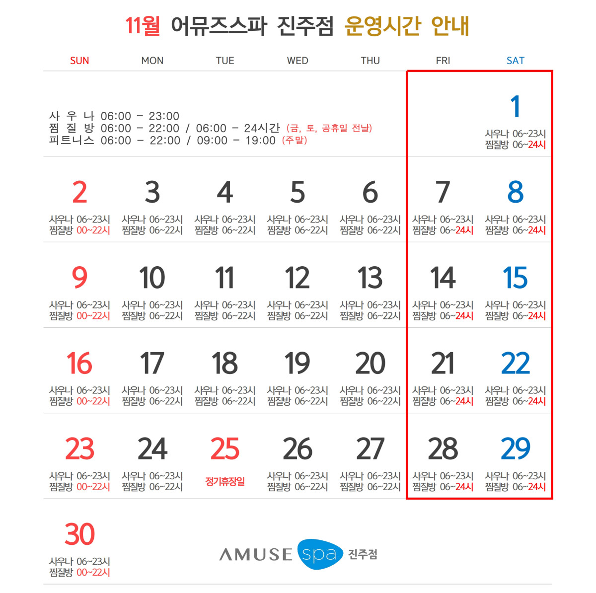 ★ 11월 어뮤즈스파진주점 운영시간표 ★
